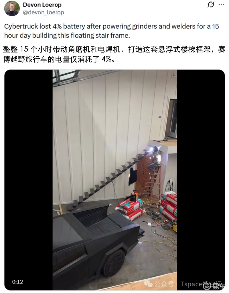 近来,海外博主 @devon_loerop 在交际渠道发布了一段视频,展现了特斯拉赛博越野旅行车在实际运用中的强壮功用。其在进行金属楼梯结构焊接施工时,直接用赛博越野旅行车作为电源,为角磨机和电焊机等高功率设备继续供电长达15小时。