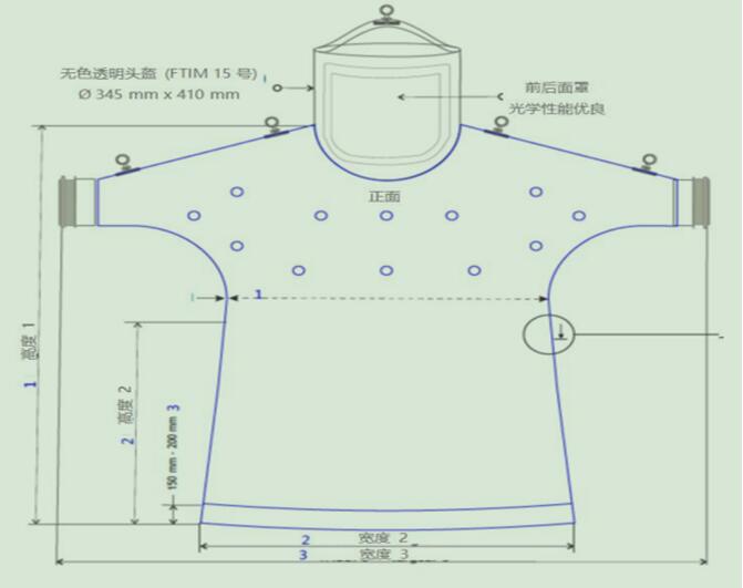 1)半身防护服及头盔由压延成型、有涂层的塑料和无色通明 PVC 膜制成操作性能好,阻隔液体及低浓度化学物质;